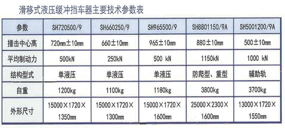 主要技术特点:滑移式液压缓冲挡车器是在滑移式挡车器基础上进行改进设计的,增加了液压缓冲装置,在增加制动力的同时,主要给失控车辆更好的缓冲保护,减少车辆损坏。滑移式液压缓冲挡车器主要有三个系列产品,分别是:①滑移式单液压缓冲挡车器②滑移式双液压缓冲挡车器(防爬型、重型)③滑移式液压缓冲挡车器(辅助轨式)。